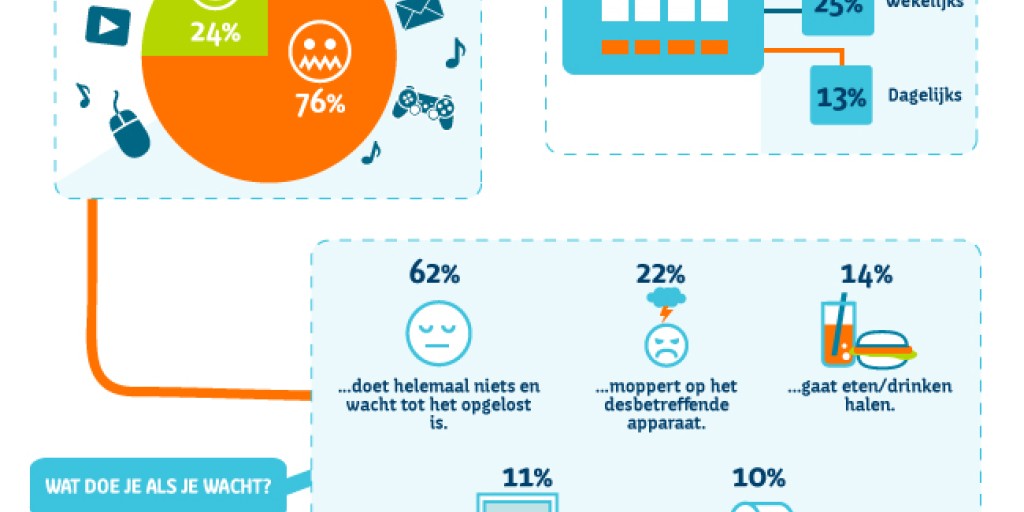 Vooral voor het streamen van muziek of films en voor online TV en video's kijken hebben de respondenten behoefte aan een snelle verbinding. Wanneer er sprake is van een verbinding die te wensen overlaat, doet bijna twee derde van de respondenten niets en wacht gewoon tot het probleem vanzelf is opgelost. 23 procent moppert op het betreffende apparaat. Anderen proberen de tijd te doden met het halen van eten of drinken (14%), een bezoek aan het toilet (10%) of het erbij pakken van een ander apparaat om het daarmee te proberen (11%).